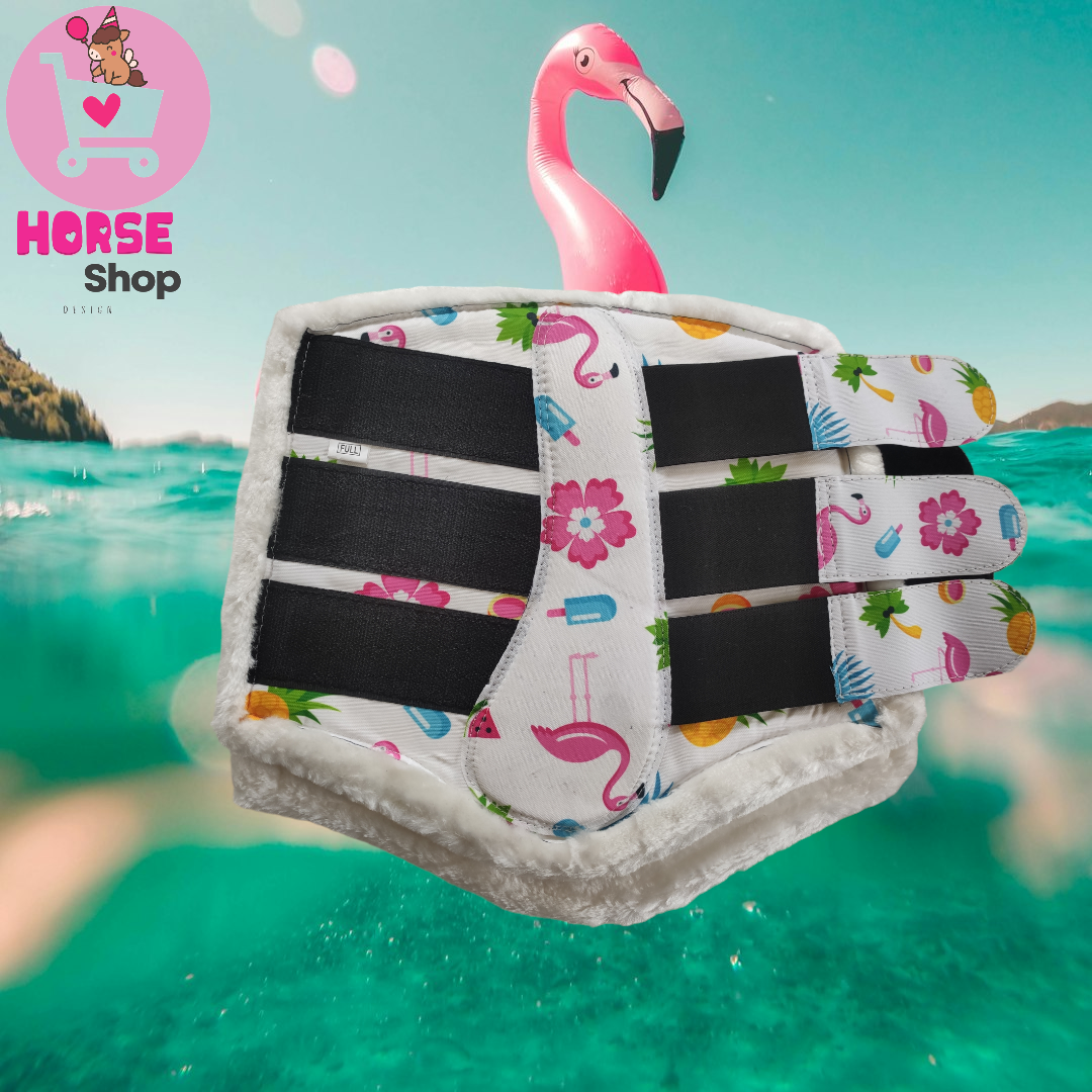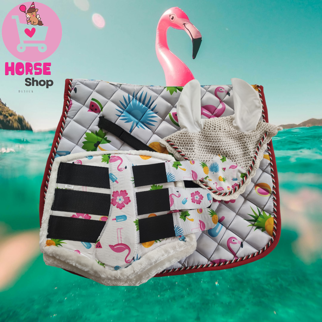 Ensemble assorti Tapis de selle, bonnet d’âne et protections fermées par scratch et élastiques motif flamant rose. Ce tapis de selle mixte est doté d’une doublure en polyester  qui garantit une excellente respirabilité. Tapis avec passants de sangle Très esthétique et original   Livré avec bonnet et guêtres doublées mouton synthetique assorties